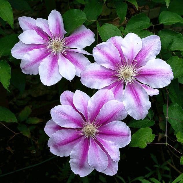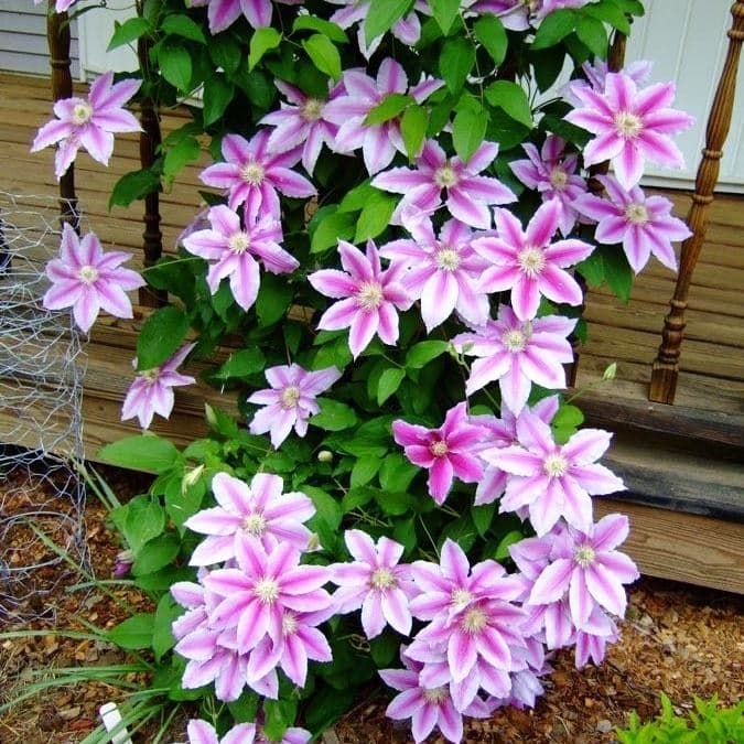 Умеренно растущий клематис Нелли Мозер соединил в себе не только нежность и яркие краски, но и удивительный контраст. Его соцветия – это светлые розово-лиловые лепестки, посередине которых проходит насыщенно-розовая полоса. Каждый бутон украшают изящные красные тычинки. Цветет Нелли Мозер настолько пышно и обильно, что порой даже сложно разглядеть за нежно-розовым «ковром» зеленые листья.